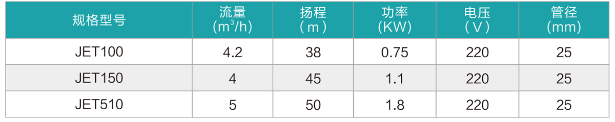 JET喷射泵结合了离心泵与自吸泵的功能和优点,具有安装使用方便、结构紧凑、小巧便捷、效率高、耗电省、扬程高、流量大、使用前不需要排气等特点。 广泛用于工矿企业、高层住宅的高压供水以及冲洗、花园喷泉等场合。泵与单相卧式电机同轴、电机壳体为铝压铸、双端面机械密封件结构。