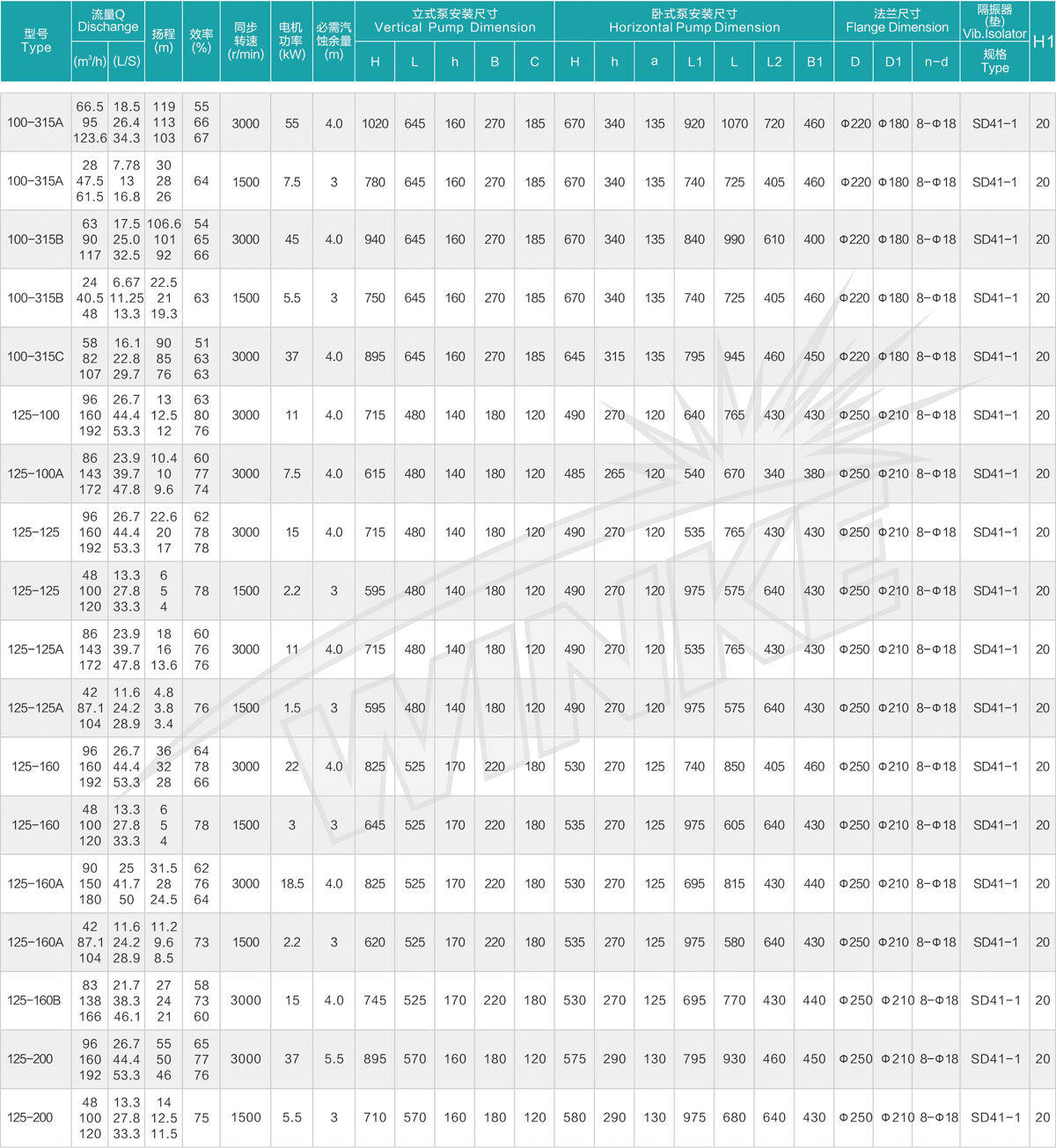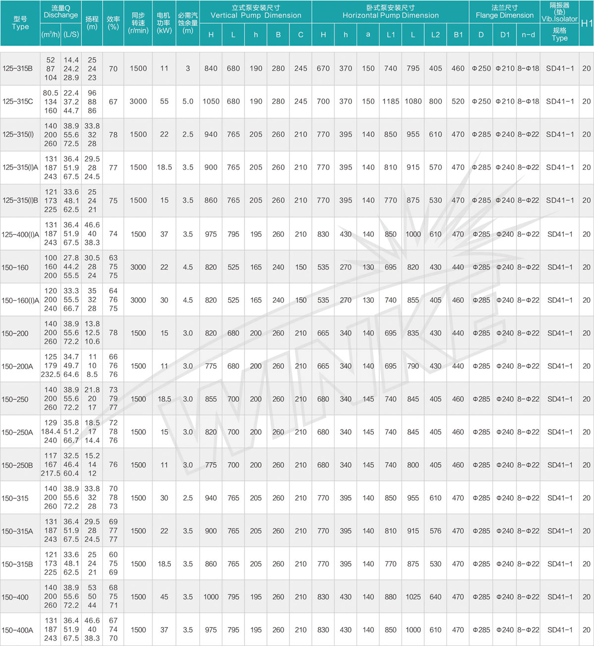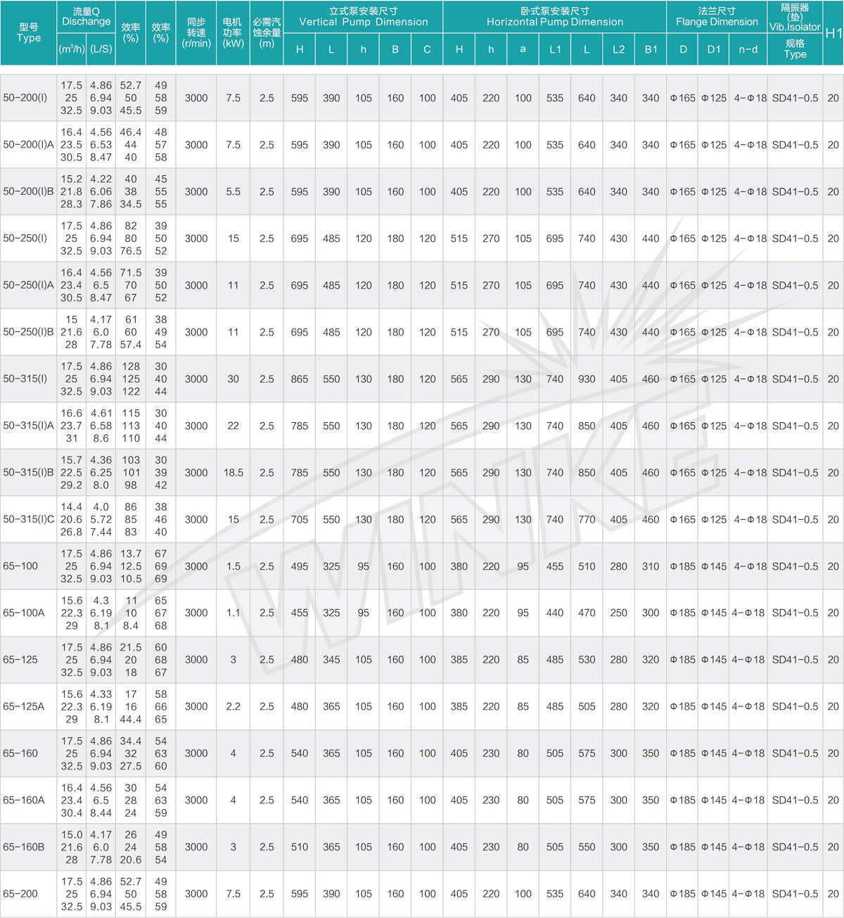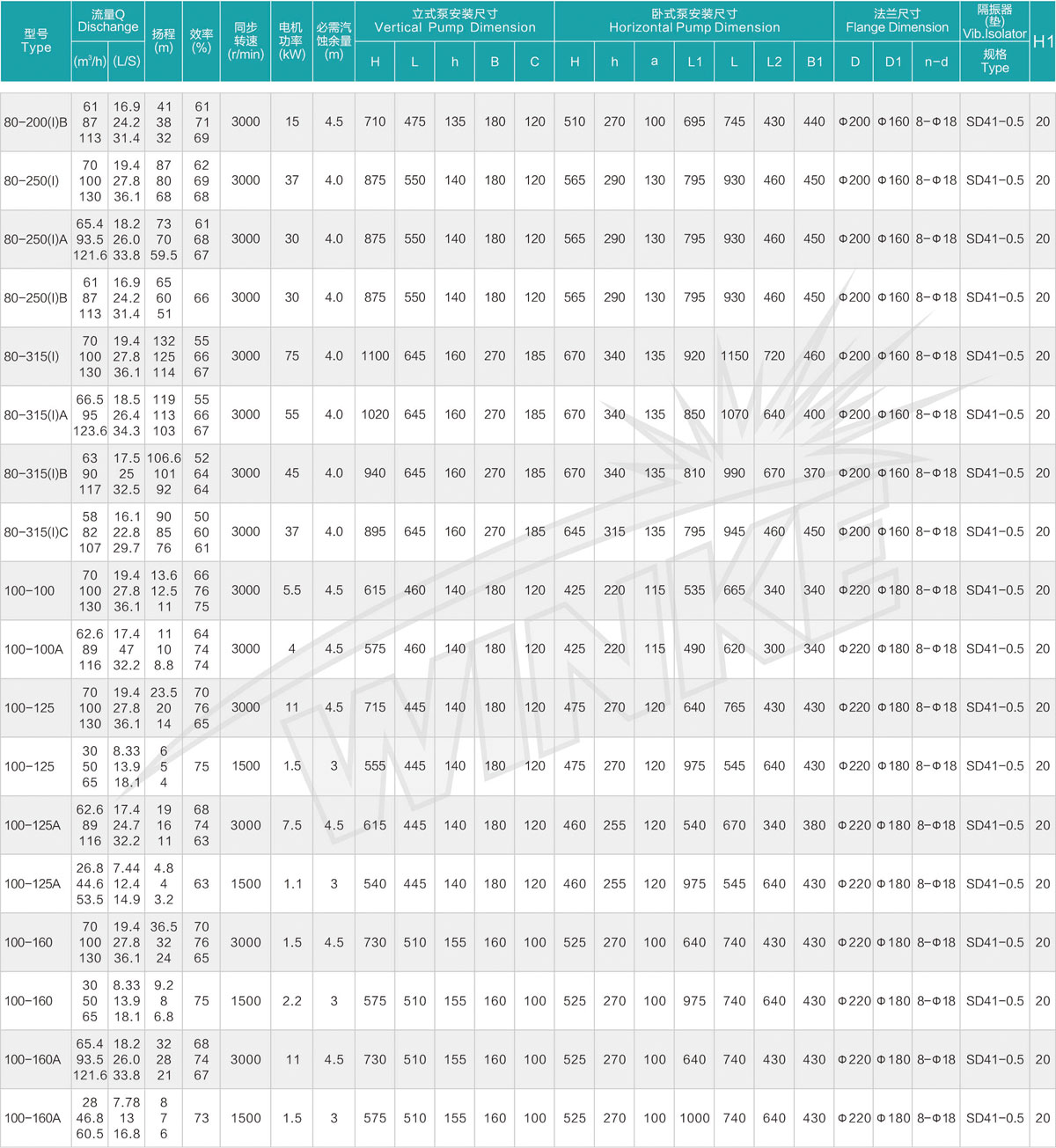 1、泵系统最高压力为1.6MPa.即泵吸入口压力+泵扬程≤1.6MPa。(订货时请注明系统工作压力、泵系统工作压力大于1.6MPa时,应在订货时另行提出。以便在制造时泵的过流部分和联接部分采用铸铁材料。)