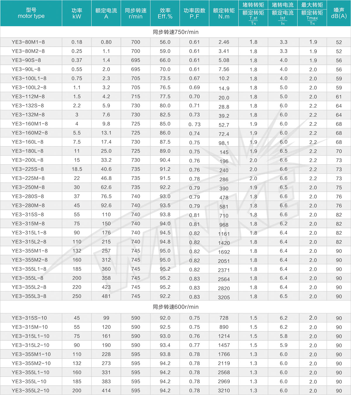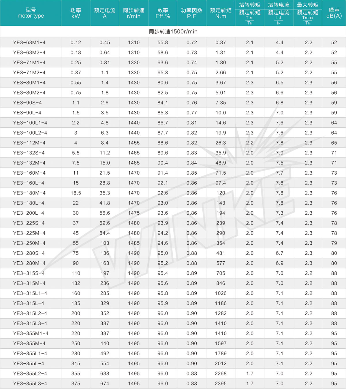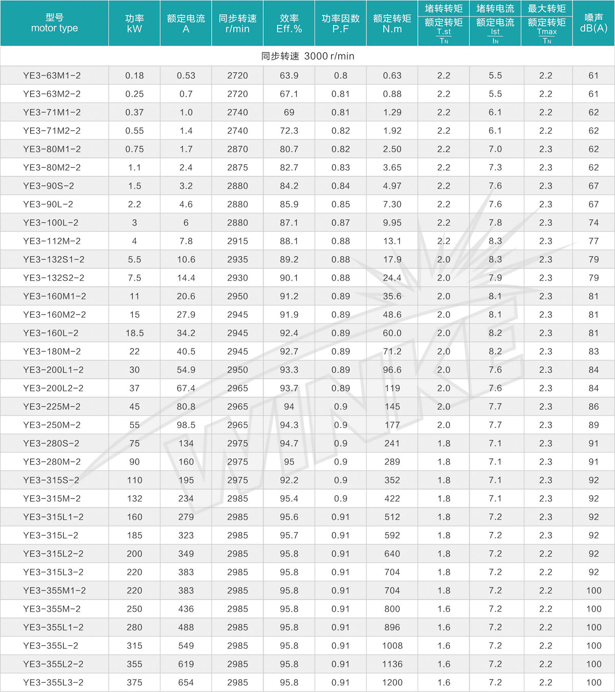 现场条件: YE3系列超高效率三相异步电动机可适用于大多数的场合及环境。电动机标准工作条件为-20℃到+40℃,海拔1000米。 温升和绝缘: 电动机按F级绝缘设计(155℃ ),按B级绝缘考核(80K ), 电动机的使用寿命和可靠性得到保证。 冷却和通风: 标准冷却方式为全封闭自扇冷(TEFC )。标准电机装有辅流式塑料风扇。符合IEC 60034-6中IC411的规定。 防护等级: 电动机的防护等级为IP55,可用于含尘或潮湿环境。也可根据客户要求提供更高防护等级的电动机。 电机保护: 可根据要求安装PTC、PT100等绕组和轴承测温及保护装。 电压、频率: 标准电机为380V/50HZ可设计200-660V范围内任意电压的50Hz的电动机。在供电电压偏离额定电压±5%的情况下,仍能良好运行。 振动: YE3系列超高效率三相异步电动机在空载时振动速度等级符合A级。特殊要求时,可提供B级电动机。 接线盒位置: 接线盒在机座上方或右为标准YE3系列电机。 质量保证: 从产品设计到产品出厂,遵循ISO9001质量认证体系,严格遵守质量程序。